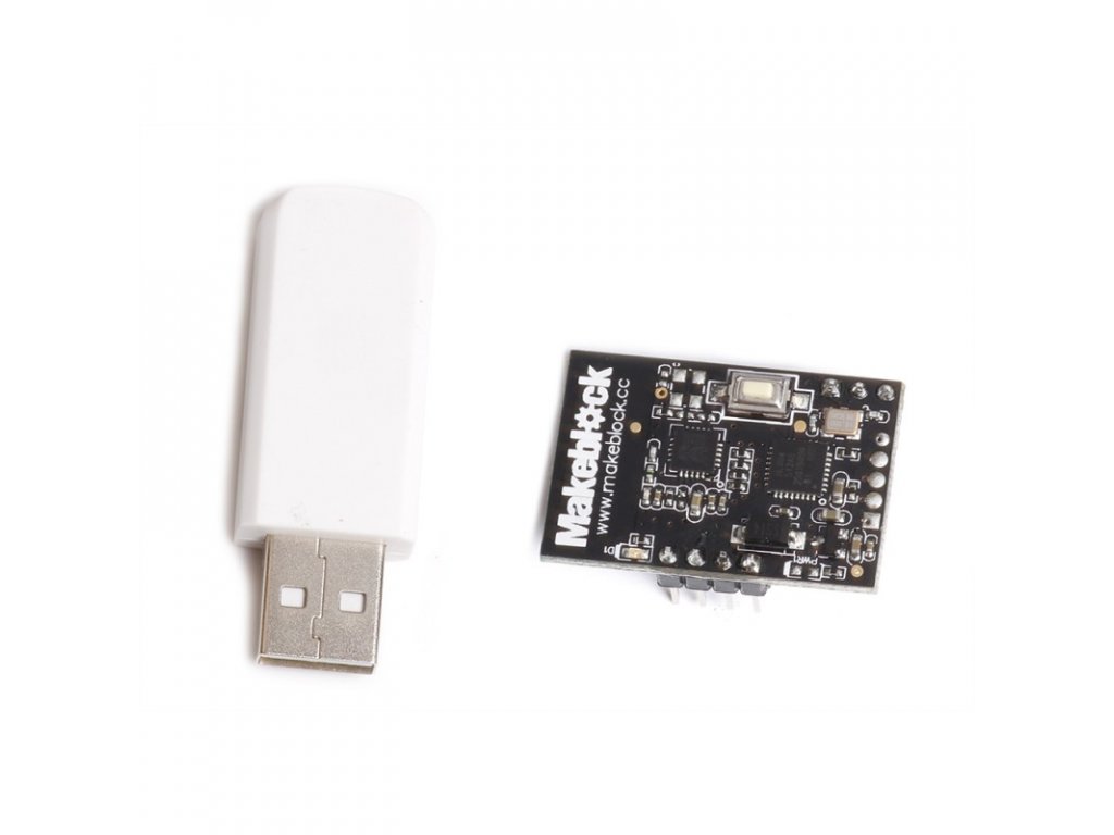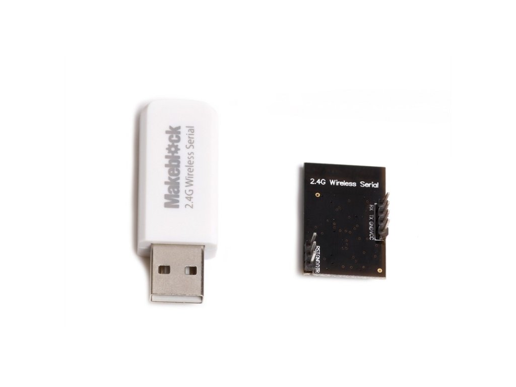Tento modul bezdrátové sériové linky slouží k propojení počítače s Arduino robotem mBot. Je vhodný k použití ve třídách a prostorách, kde bezdrátovou komunikaci používá více lidí. Je totiž méně náchylný na rušení, než Bluetooth modul. Použitá technologie je stejná, jako u bezdrátové myší. Díky tomu, že set obsahuje pár vysílač-přijímač, není nutné další párování. Stačí připojit jeden modul k robotovi a druhý do USB portu počítače. Modul vám umožní bezdrátově pracovat s robotem mBot v prostředí mBlock.