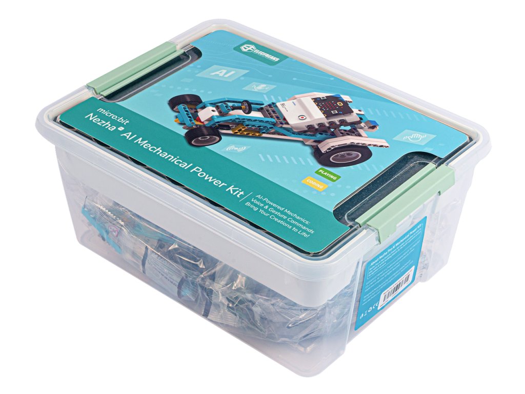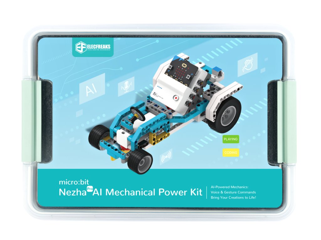 Sada micro:bit Nezha Pro AI Mechanical Power Kit – robotická AI stavebnice pro děti propojuje mechanické modely z více než 500 stavebnicových kostek s chytrými motory, senzory a umělou inteligencí. Děti tak mohou stavět roboty, robotická ramena, vozítka nebo „mechanické mazlíčky“ a ovládat je hlasem, gesty i klasickým programováním v MakeCode.