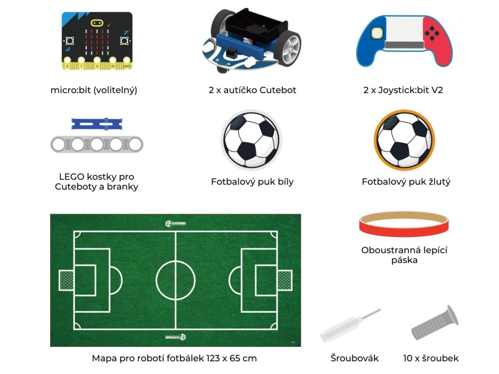 Sada obsahuje vše potřebné pro uspořádání napínavých fotbalových zápasů – od programovatelných Cutebot autíček, přes speciální fotbalové puky až po LEGO kostky pro vytváření branek a Cutebot nárazníků. Součástí je také mapa s hřištěm, lepící páska a potřebný spojovací materiál. Desky microbit je potřeba zakoupit zvlášť. Pro plnou hru jsou potřeba 4 desky microbit. Dvě pro Cuteboty a dvě pro gamepad ovladače.