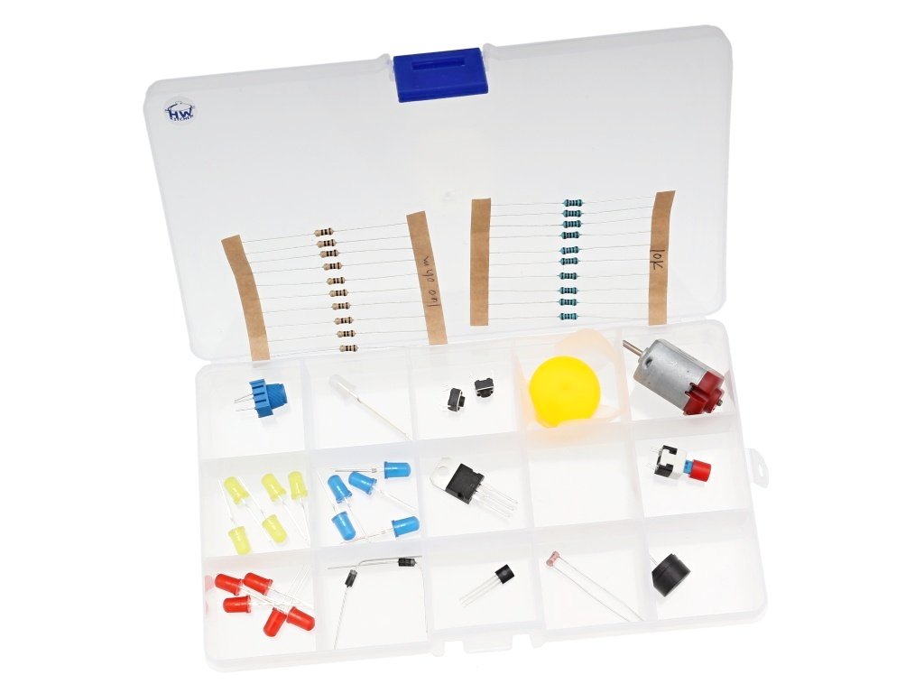 V sadě najdete 24 typů elektronických komponent, díky kterým si hned postavíte jednoduché obvody a projekty – od práce s LED a tlačítky, přes bzučák a teplotní čidlo, až po servo a motor nebo barevné světelné prvky.