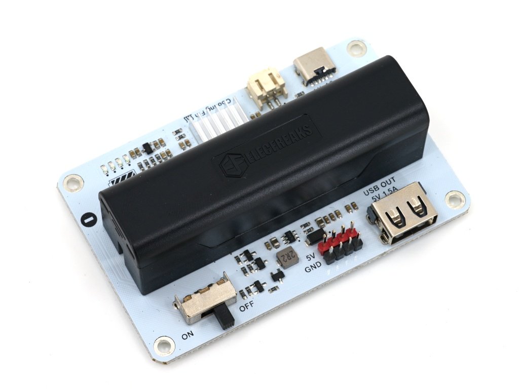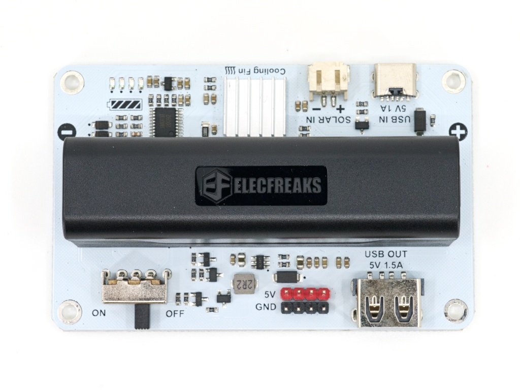 Modul poskytuje výstup přes kolíkovou lištu (piny) a rozhraní USB-A, s podporou 5 V / 1,5 A. Na desce jsou k dispozici označené piny 5V a GND a konektor USB OUT (5 V 1,5 A) pro přímé napájení micro:bit, Arduino, senzorů a dalších modulů.