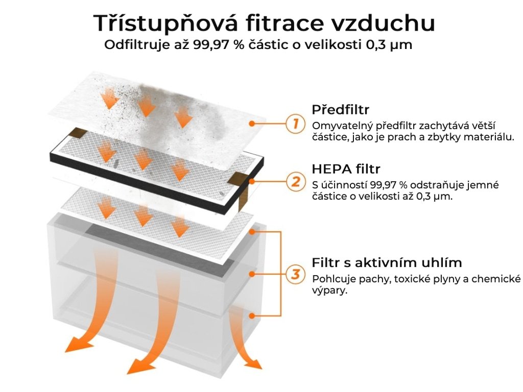 - Třífázová filtrace: hrubé nečistoty → jemný prach → pachy a kouř.