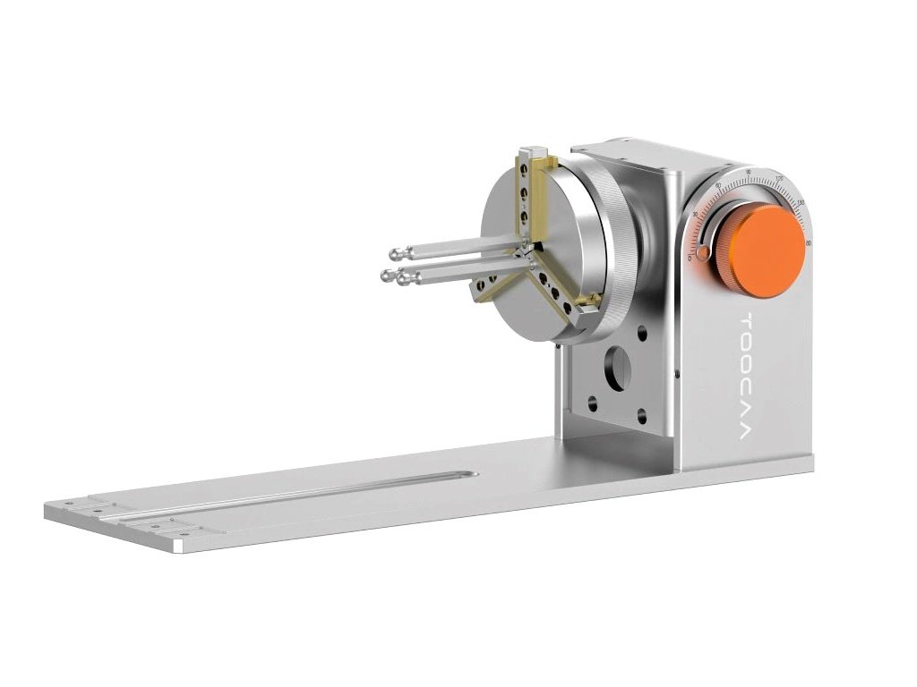 TOOCAA rotační modul 5v1 pro L2 využívá přesný krokový motor, který otáčí upnutým předmětem s rozlišením 0,02° na krok. Díky tomu se laserový paprsek dostane postupně na celou plochu válcového, kulového nebo jinak tvarovaného objektu a gravírování zůstává ostré a bez deformací.