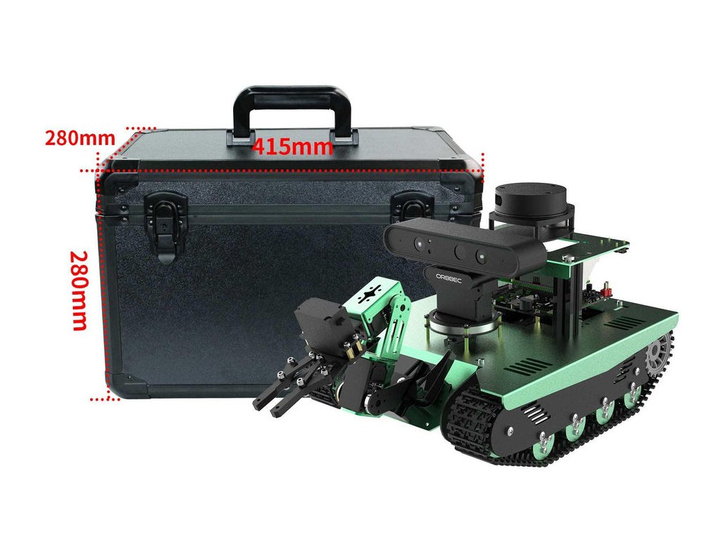 - Robustní konstrukce: hliníkový pásový podvozek, přesné držáky pro LiDAR, kamery, displej i rameno.
